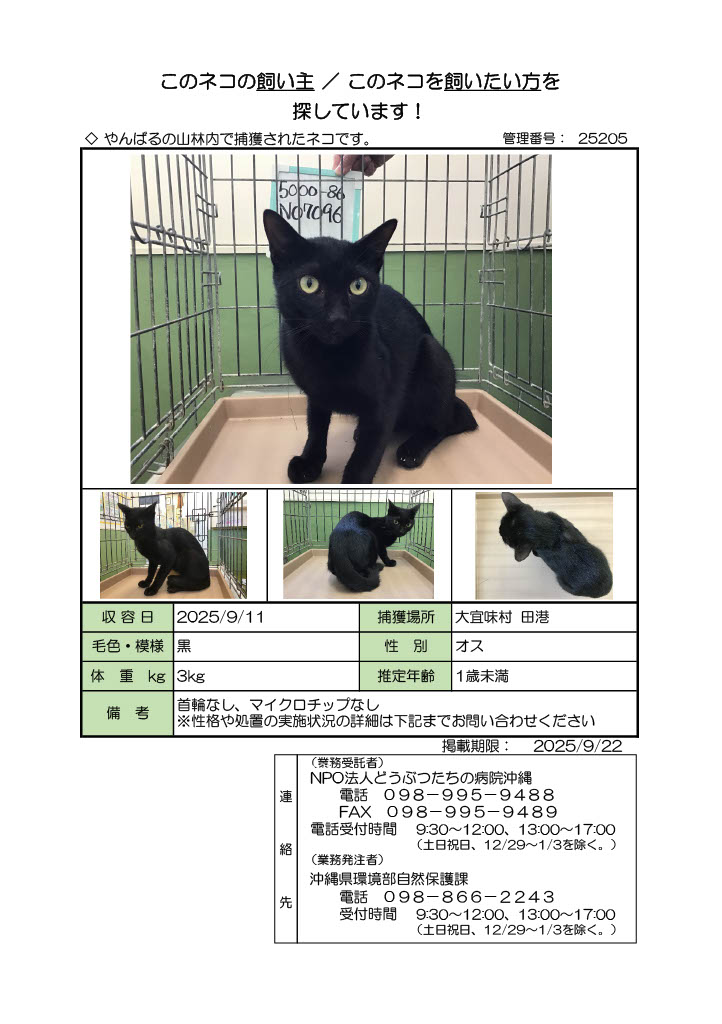 ネコの保護情報及び譲渡情報 保護ネコ情報 保護ネコ(9.12〜9.22) (JPEG: 119.8KB) 譲渡ネコ情報 大宜味村観光協会おおぎみ猫部(仮) 新着情報 NEW! 現在、新着情報はございません。 関連リンク 沖縄県保護ネコ情報