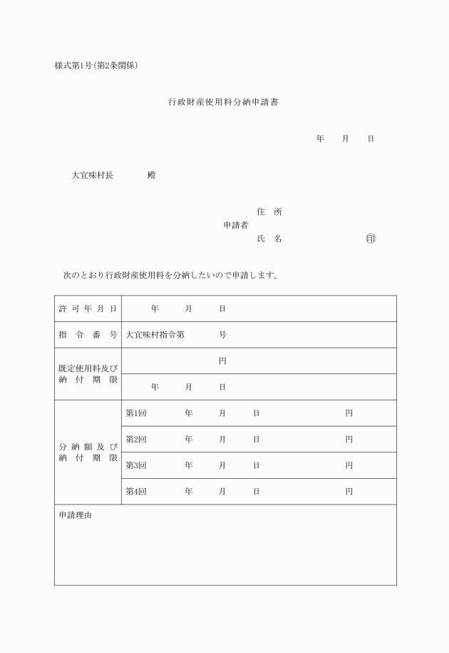 第2条 条例第5条第1項ただし書の規定に基づき、使用料の分納をしようとする者は、使用期間が1年以内の場合は使用許可されたとき、使用期間が1年を超える場合は当該年度の4月30日までに行政財産使用料分納申請書(様式第1号)を提出しなければならない。
