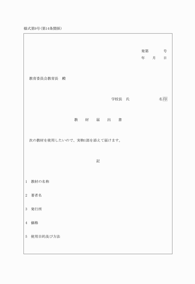 第14条 校長は、学年又は学級若しくは特定の集団全員の教材として、計画的、継続的に使用する教科用図書又は準教科書と併せて使用する副読本については、使用20日前までに教材届出書(様式第9号)により、教育委員会に届け出なければならない。
