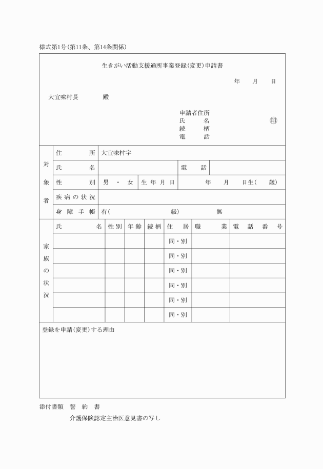 第11条 事業を受けようとする者は、生きがい活動支援通所事業登録(変更)申請書(様式第1号)に、次に掲げる書類を添付して、村長に登録の申請をしなければならない。