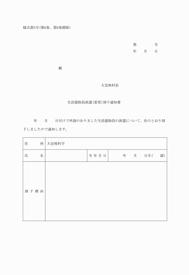 第5条 生活援助員の派遣を受けようとする者は、あらかじめ生活援助員派遣(変更)申請書(様式第1号)に介護保険認定主治医意見書の写しを添付し村長に提出しなければならない。
