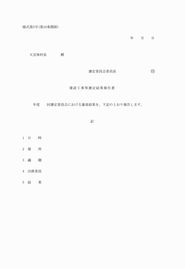 第10条 委員長は、選定委員会で審査した結果を建設工事等選定結果報告書(様式第3号)により、村長に報告しなければならない。