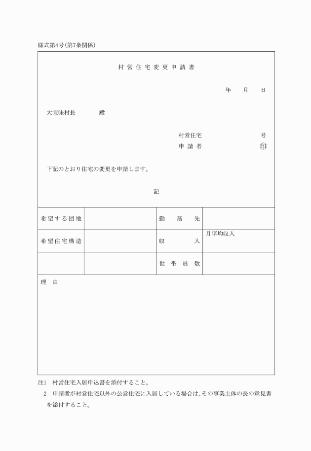 第21条 条例第26条ただし書の規定により用途併用の承認を受けようとするときは、村営住宅用途併用承認申請書(様式第32号)を村長に提出しなければならない。