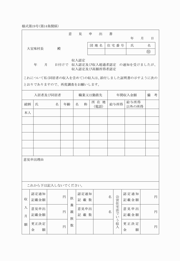 6 入居者は、年度途中において、収入が変動し、収入の再確認を求めようとする者は、収入が変動した日から30日以内に収入再認定申請書(様式第20号)を村長に提出しなければならない。
