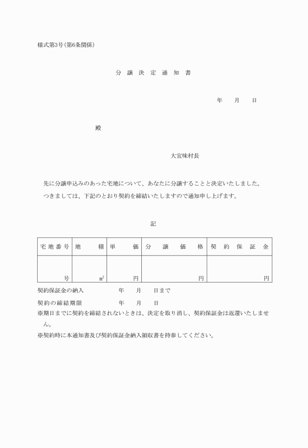 2 村長は、譲受人を決定したときは、直ちに譲受人に分譲決定通知書(様式第3号)で通知するものとする。