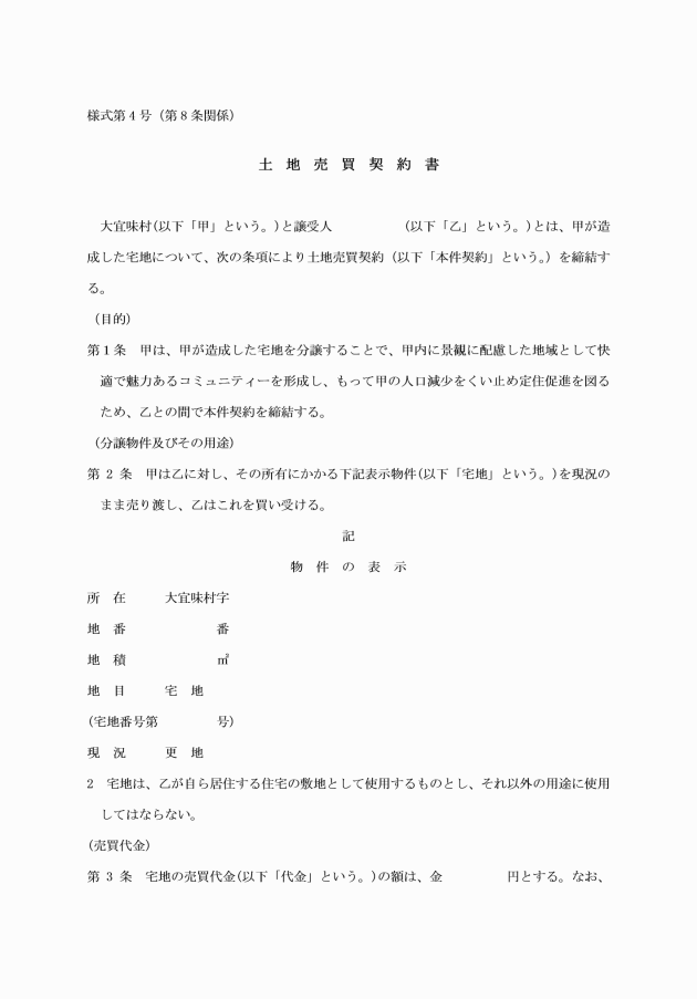 第2条 宅地の譲受人(以下「譲受人」という。)の募集は、村が発行する広報への掲載その他適当な方法で行うものとする。