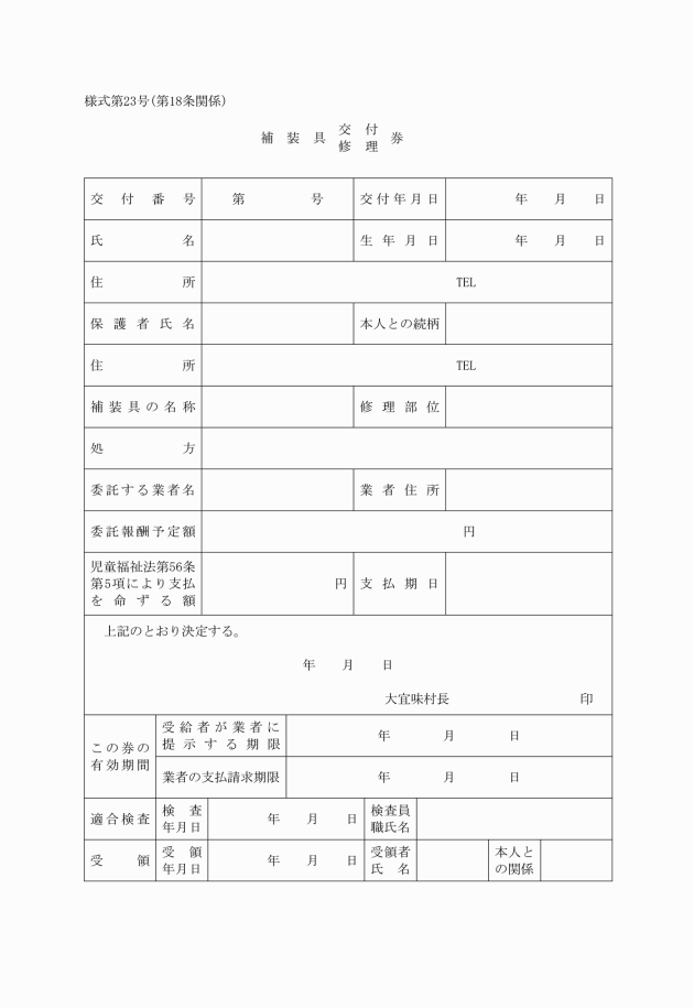 第21条 業者は、補装具交付・修理券を請求書に添えて定められた期日までに村長に補装具交付(修理)費を請求するものとする。
