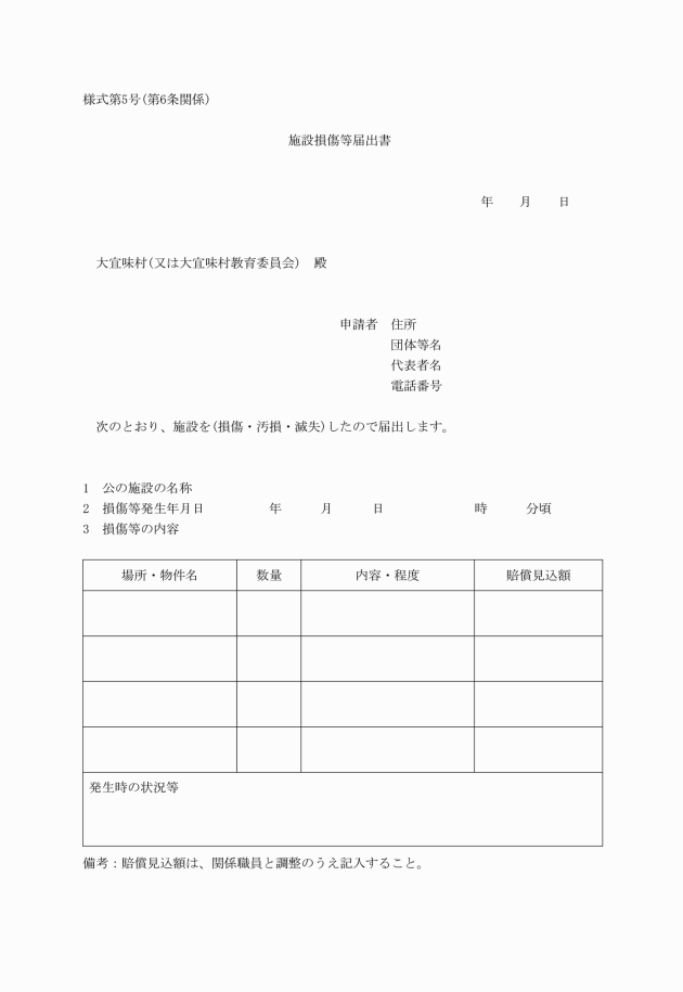 第6条 公の施設を損傷し汚損し又は滅失した者は、直ちに施設損傷等届出書(様式第5号)を村長等に届出なければならない。