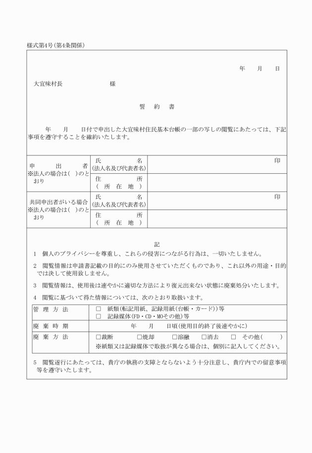 (4) 閲覧事項を申出の際に明らかにした利用の目的以外に利用しないこと等を記載した誓約書(様式第4号)