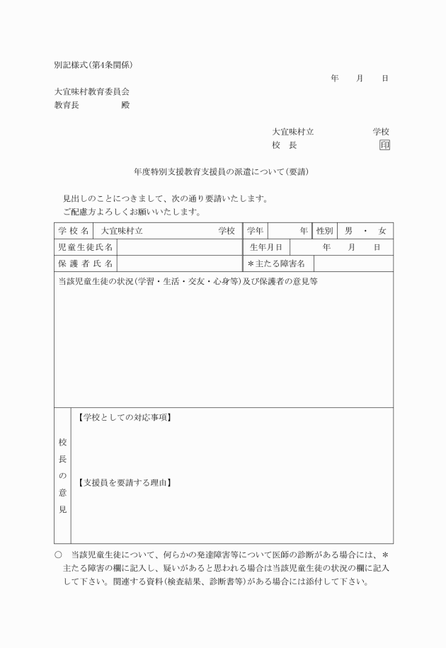 第3条 校長は、第2条の「支援員派遣の条件」に該当すると認められる児童生徒が在籍し、適切かつ必要な手だてを講じたにもかかわらず学級運営に著しい困難をきたしている場合、若しくは学級経営に著しい困難をきたすことが十分予想される場合は、村教育委員会に対し、支援員の派遣を申請をすることができる。