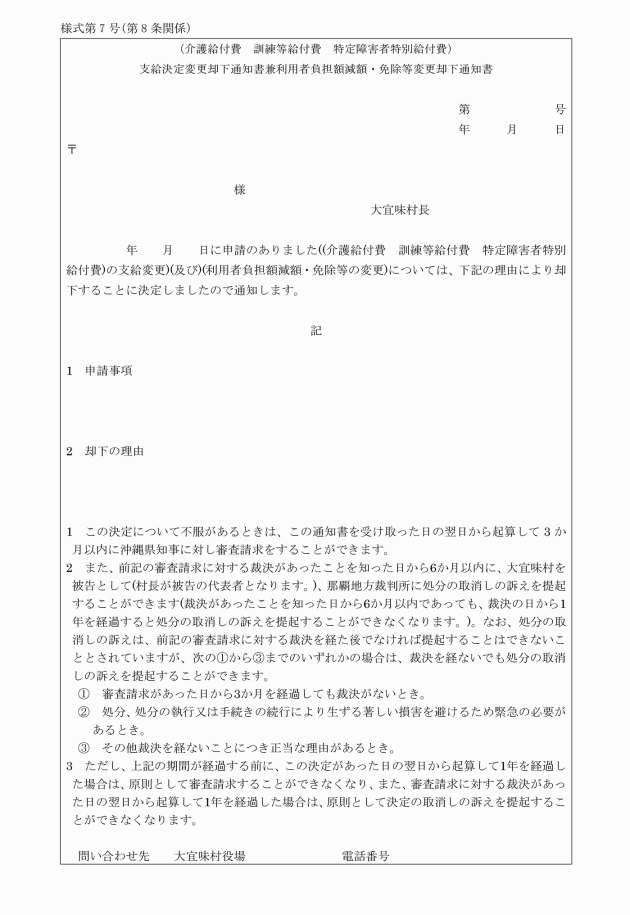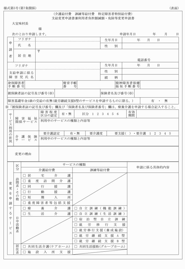 第7条 省令第17条に規定する支給決定の変更の申請書は、(介護給付費 訓練等給付費 特定障害者特別給付費)支給変更申請書兼利用者負担額減額・免除等変更申請書(様式第5号)によるものとする。
