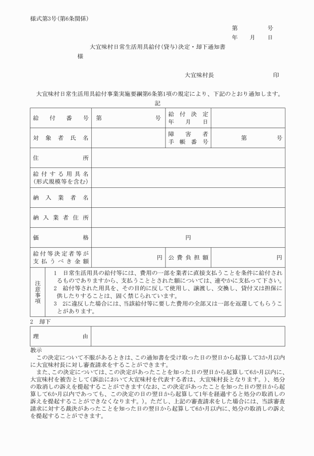 第4条 用具の給付等を受けようとする障害者等、難病患者等又はその保護者(配偶者、親権を行う者、後見人その他の者で障害者等、難病患者等を現に保護する者をいう。(以下「申請者」という。))は、大宜味村日常生活用具給付(貸与)申請書(様式第1号)に次に掲げる書類を添えて、村長に申請しなければならない。ただし、公簿によって確認出来るときは、この限りでない。