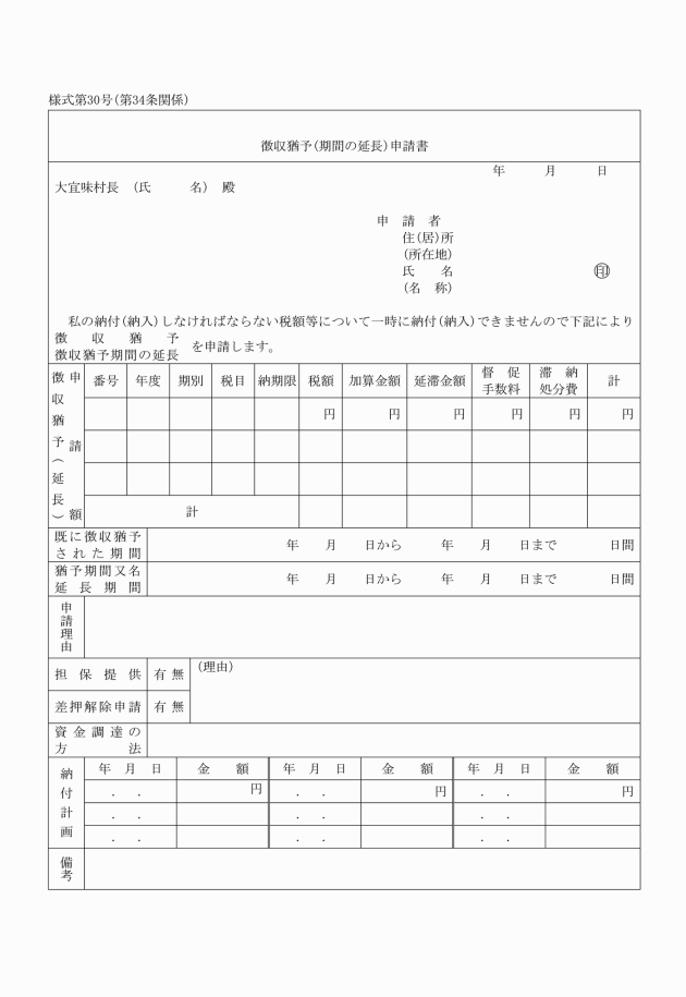 第8条 法第15条第1項又は第2項の規定による徴収猶予の申請をしようとする者は、徴収猶予(期間の延長)申請書を村長に提出しなければならない。