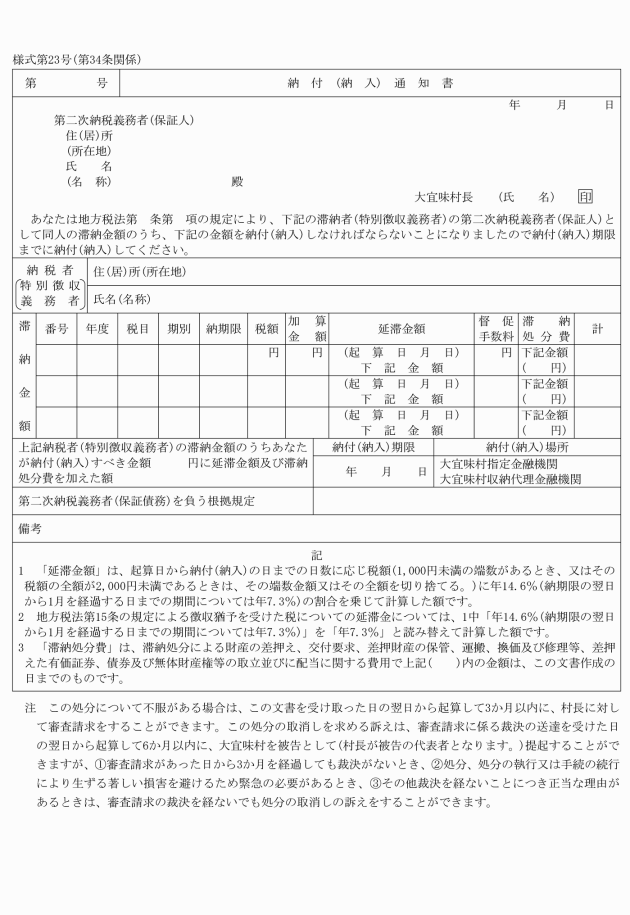 3 村長は、令第6条の13第1項の規定により第二次納税義務者が納付し、又は納入した徴収金の一部につき過誤納金が生じた場合において、当該過誤納金を還付し又は未納の徴収金に充当したときは、納税者又は特別徴収義務者に対し、第二次納税義務者の納付(納入)金に還付(充当)したときの過誤納金還付(充当)済通知書によって通知しなければならない。