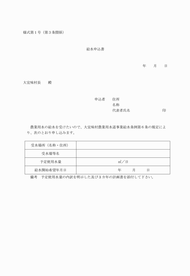 第3条 条例第6条の規定による申込みは、給水申込書(様式第1号)によるものとする。