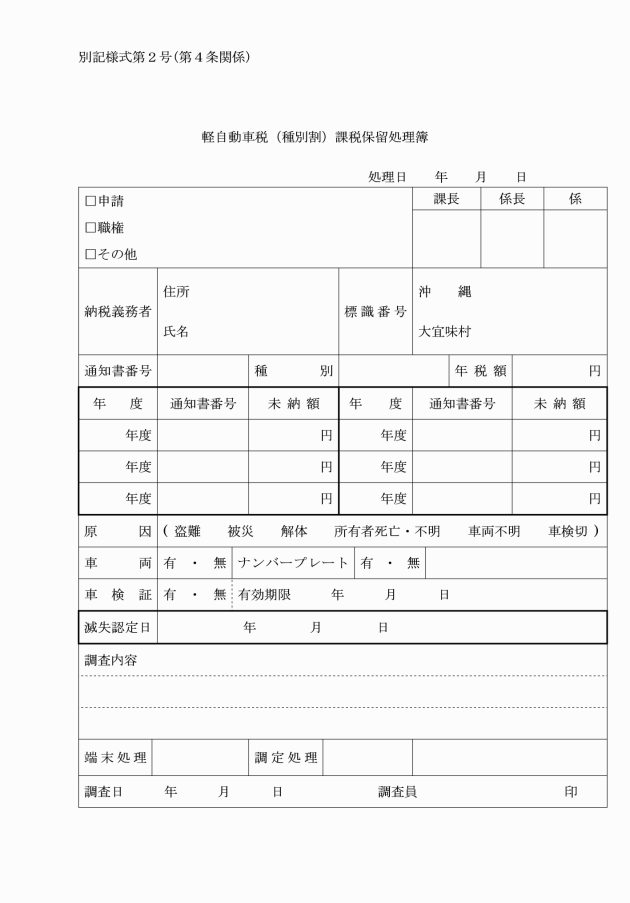 2 軽自動車税(種別割)の保留処分は、保留処分の原因ごとに整理し、大宜味村軽自動車税(種別割)保留処分処理簿(別記様式第2号)により決議する。
