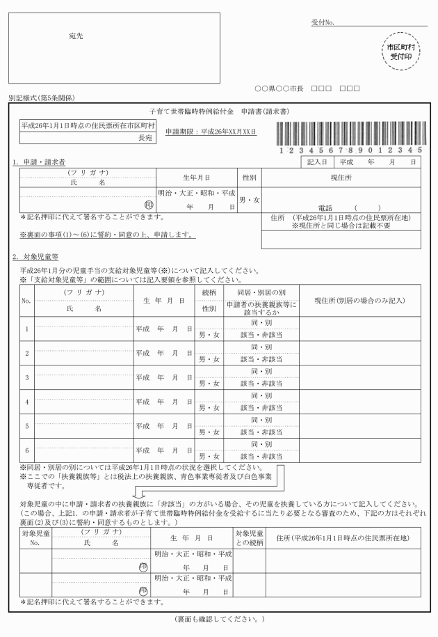 (1) 子育て世帯臨時特例給付金(以下「給付金」という。)は、平成26年1月分の児童手当法(昭和46年法律第73号)による児童手当(同法附則第2条第1項の給付を含む。以下「児童手当」という。)の支給を受ける者であって、その平成25年の所得が同法第5条第1項に規定する政令で定める額に満たないものに対して支給する。