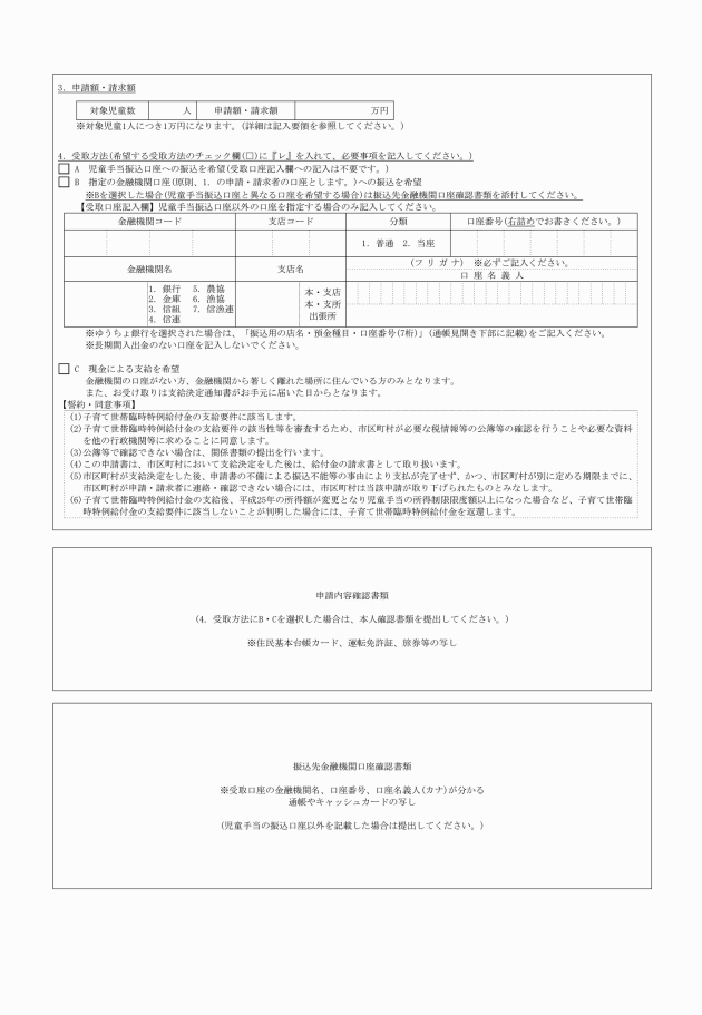 (3) 窓口現金受領方式 申請者が申請書を郵送により、又は村の窓口において村に提出し、村が当該窓口で現金を交付することにより支給する方式