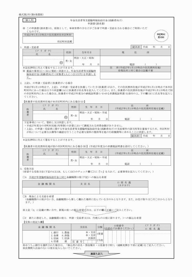 (3) 窓口現金受領方式 申請者が申請書を郵送により、又は大宜味村の窓口において大宜味村に提出し、大宜味村が当該窓口で現金を交付することにより支給する方式