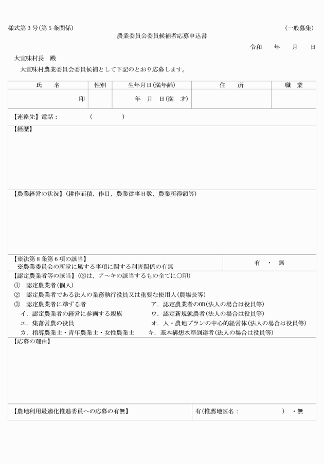 第5条 一般募集の応募者は、農業委員会委員候補者応募申込書(様式第3号)をその他村長が必要と認める書類と共に、村長が指定する場所へ直接又は郵送により提出するものとする。