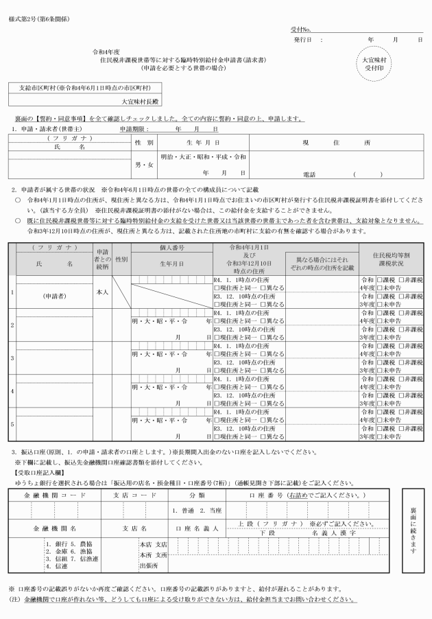 2 第6条の規定による支給の申請の受付開始日は、大宜味村長が別に定める日とし、申請期限は令和4年9月30日(ただし、令和4年度分の市町村民税均等割が非課税である世帯に対する給付に係る申請書については、令和4年10月31日)とする。