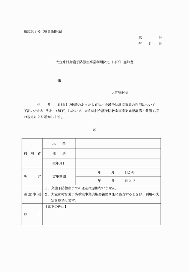第7条 事業を利用しようとする者(以下「申請者」という。)は、大宜味村介護予防教室事業利用申請書(様式第1号)を村長に提出しなければならない。