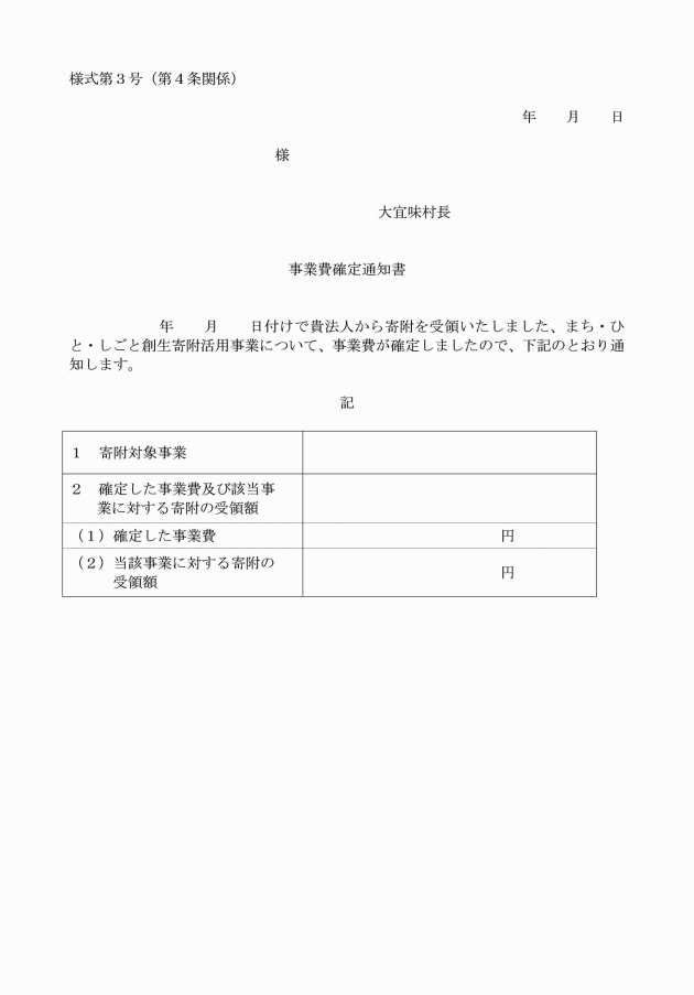 3 村長は、寄附対象事業の事業費が確定する前に寄附金等を受領したときは、事業費が確定した後に、事業費確定通知書(様式第3号)を当該寄附対象法人に通知するものとする。